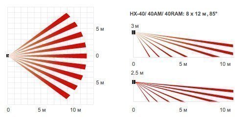 Для извещателя HX-40RAM специально разработана уникальная оптическая система из двух независимых пироэлементов, которые образуют область детекции высокой плотности, состоящую из 94 перекрестных зон.