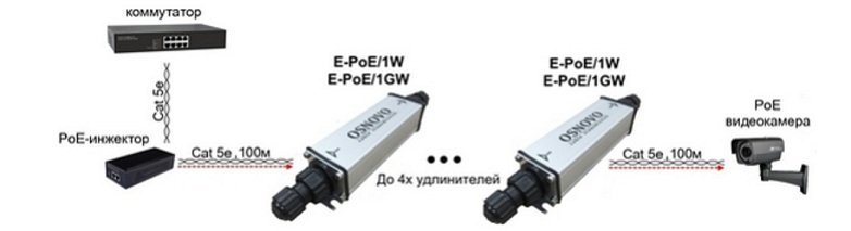 Назначение: удлинитель E-PoE/1W предназначен для увеличения расстояния передачи данных Ethernet и питания по технологии PoE (до 22W) по кабелю витой пары. При использовании одного удлинителя общее расстояние передачисоставляет до 200 м. При каскадном подключении (до 4х устройств),общее расстояние передачи данных достигает 500м.