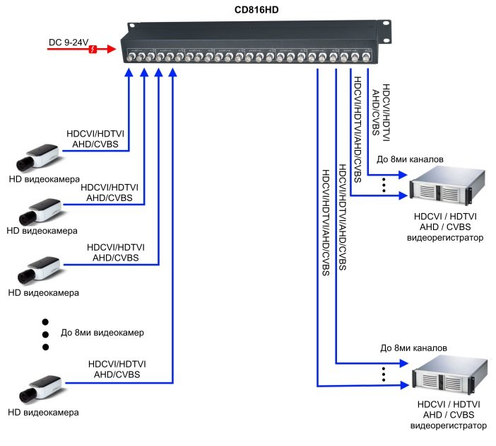 Распределители CD816HD, CD1632HD с успехом могут быть использованы в системах аналогового видеонаблюдения (HDCVI/HDTVI/AHD/CVBS), когда необходимо передать сигнал с видеокамер сразу на несколько видеорегистраторов.