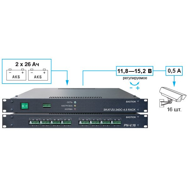 Источник предназначен для питания по шестнадцати выходам видеокамер и других нагрузок с номинальным напряжением питания 12 В и номинальным током потребления по каждому выходу до 0,5 А при работе от сети переменного тока 220 В и в режиме резерва – от аккумуляторной батареи (далее по тексту – батареи) с номинальным напряжением 24 В. Источник имеет в составе два модуля высотой 1U и предназначен для установки в стойки или шкафы 19"