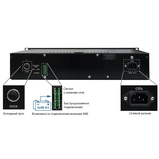 * источник имеет возможность установки АКБ в корпус, либо подключения внешних АКБ ёмкостью до 40 Ач.