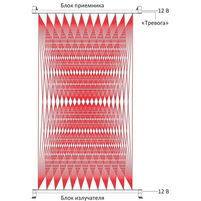 Извещатель состоит из блока излучателя (БИ) и блока приемника (БП), расположенных на противоположных сторонах зоны обнаружения. Между БИ и БП формируется плотный ИК-занавес, состоящий из 144 лучей, пересечение хотя бы одного луча которого приводит к формированию извещения “Тревога”.