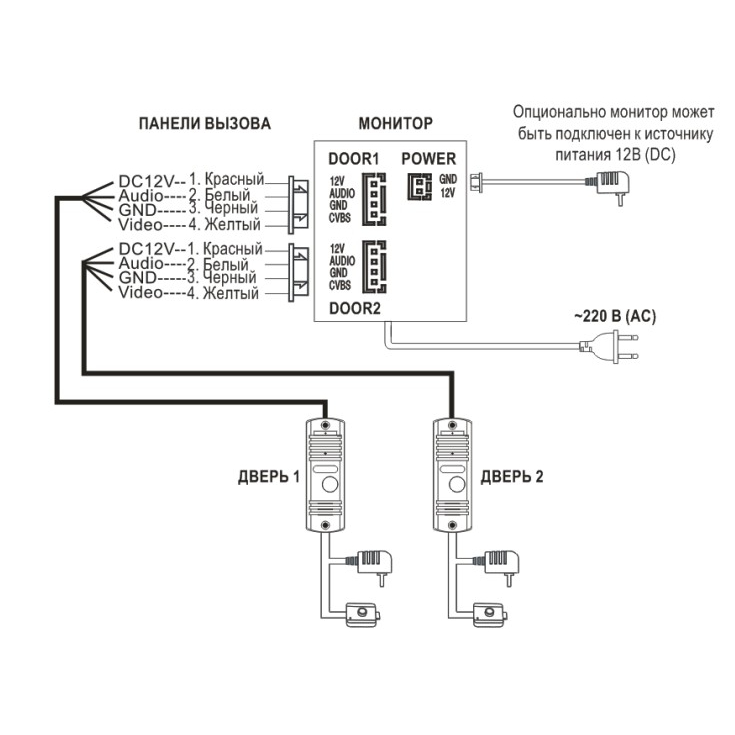 Внимание: кабель КСПВ идущий в комплекте предназначен для подключения замка к вызывной панели и БП, его можно использовать и для подключения домофона к панели, но КСПВ не экранирован и у него сильное затухание сигнала. Длина подключения вызывной панели к видеодомофону, обычно, не должна превышать 10-20 метров при большей дальности нужно применять специальный кабель для передачи видеосигнала, например КВК.