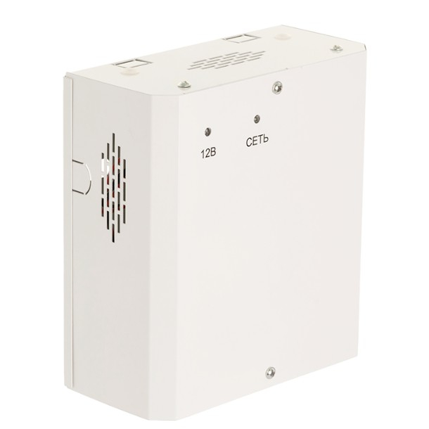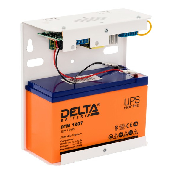 блок бесперебойного питания с металлическим корпусом, входное напряжение 100-260 В, выходное 13.6 В, номинальный ток нагрузки 5 А, защита от перегрузок и короткого замыкания, защита аккумулятора 12 В 7 А·ч от глубокого разряда -15...+50 °C, 174х164х76 мм, масса 0.7 кг.