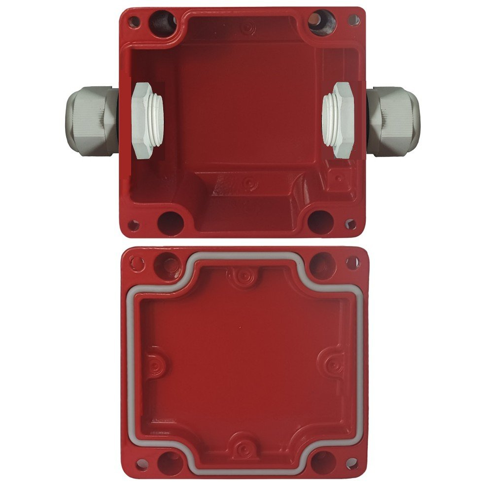 Коробка соединительная металлическая, корпус из алюминиевого сплава, 90х90х62мм. цвет красный RAL 3020, 2 кабельных ввода ПКВ20х1,5 (под кабель от 6 до 12 мм ). Предназначена для соединения (разветвления): электрических проводок в цепях с медными и алюминиевыми жилами, сигнальных кабелей, например, в шлейфах пожарной или охранно-пожарной сигнализации, линиях связи и телекоммуникаций, цепях в системах управления и автоматики, а также подключения в шлейфы оконечных устройств, например датчиков сигнализации, абонентских устройств систем связи и т. п.