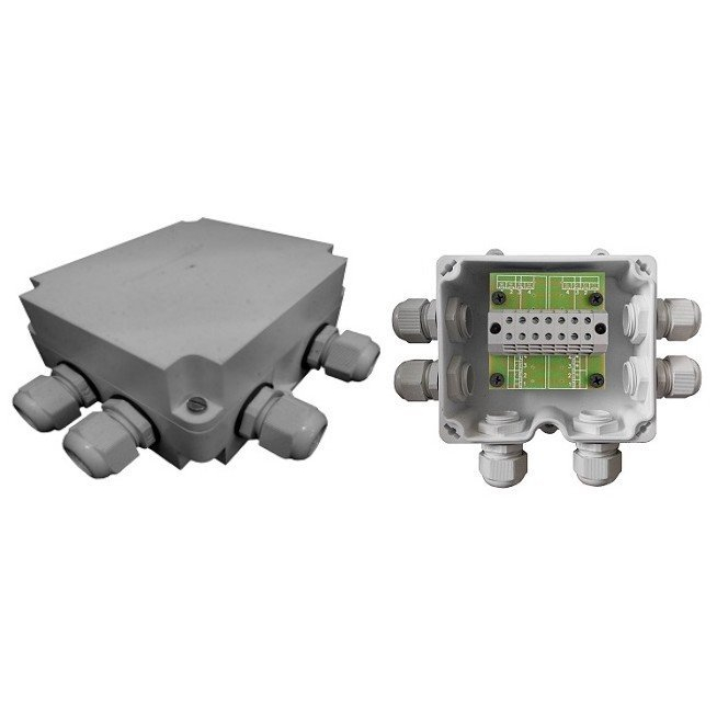 Устройство соединительное в корпусе из пластика, 4 металлических кабельных ввода (6-12), тип клеммников - РМ2, предназначено для соединения (разветвления) электрических проводок в цепях с медными и алюминиевыми жилами, сигнальных кабелей, например в шлейфах пожарной или охранно-пожарной сигнализации, линиях связи и телекоммуникаций, цепях в системах управления и автоматики, а также подключения в шлейфы оконечных устройств, например датчиков сигнализации, абонентских устройств систем связи и т.п.