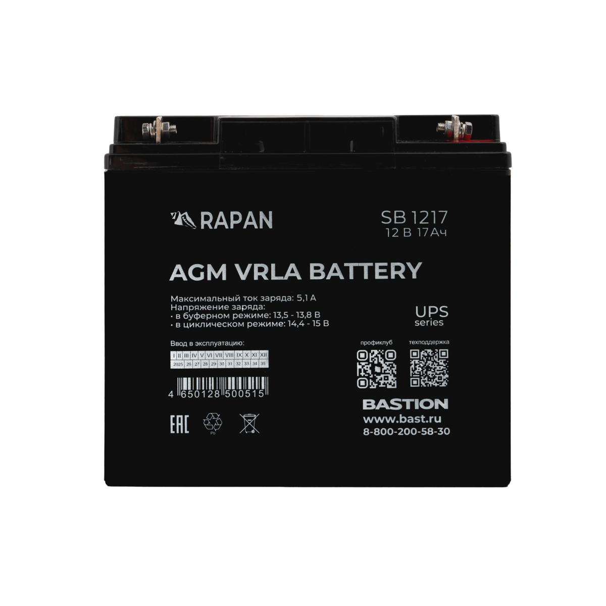 Аккумулятор герметичный свинцово-кислотный необслуживаемый RAPAN SB 1217 c пониженным внутренним сопротивлением производится по технологии AGM (Absorbent Glass Mat) с системой рекомбинации газов VLRA и предназначен для использования в составе системы резервного питания.