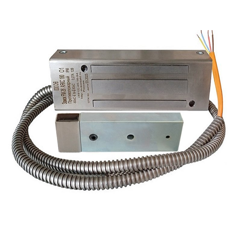 Замок электромагнитный. Сила удержания 350 кг, с герконовым датчиком положения, 24 В, 120 мА, IP66, -60...+60 С, 200х60х41 мм, 5 кг, вывод - огнестойкий кабель в металлорукаве 2м (другая длина по заказу),комплект поставки: корпус замка, планка, угольник, монтажная пластина, якорь, пластина крепления якоря, комплект крепления якоря. Защитный кожух (цвет кожуха – выбрать). Предназначен для применения в системах безопасности объектов, в системах пожарной и охранно-пожарной сигнализаций в качестве управляемого запирающего устройства.