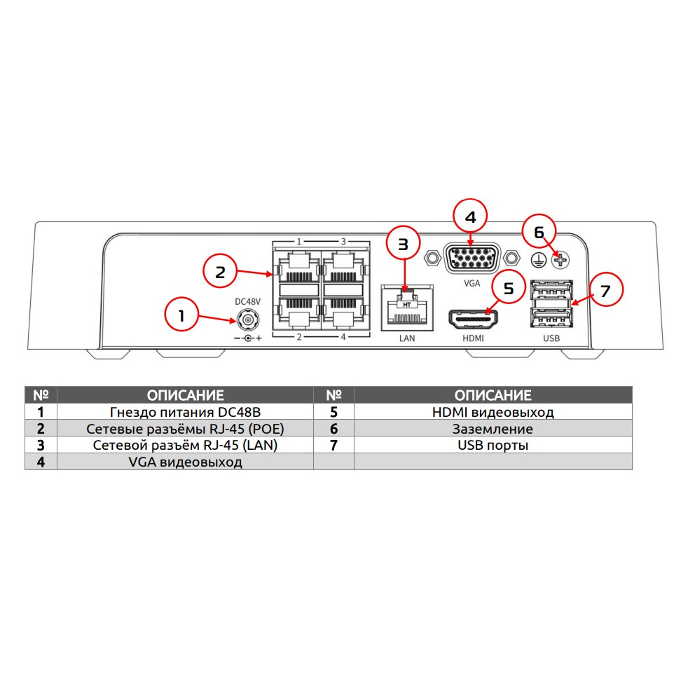 IP видеорегистратор NVR, 4 канала, битрейт 60Мбит/с/40Мбит/с, декодирование камер до 6Мп, 1 SATA III 3.5 , 6ТБ макс. размер диска, однопотоковая запись, без аудио интерфейсов, без тревожных интерфейсов, дублирующиеся 1 HDMI/1 VGA, 4 10/100BASE-T, PoE 802.3af/at, PoE бюджет 28Вт, 1 10/100BASE-T, только детектор движения камер, подключение сторонних камер по ONVIF (PROFILE S/T), RTSP