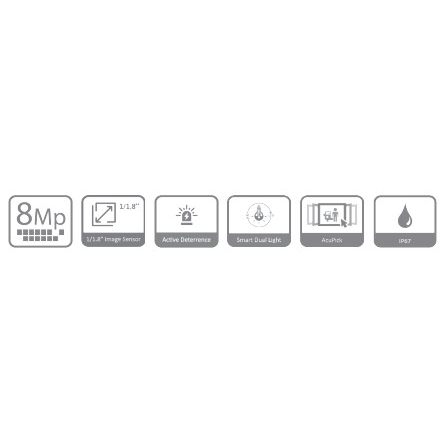8 Mп уличная купольная IP-видеокамера Full-color с ИИ и активным сдерживанием. 1/1.8” 8Мп CMOS, фиксированный объектив 2,8мм (3,6, опционально), сжатие: H.265+/H.265/H.264+/H.264/H.264B/H.264H/MJPEG, разрешение и скорость трансляции видео: 8Мп (3840х2160) 25к/, чувствительность: 0.0008лк/F1.0, ИК-подсветка 30м, Led-подсветка 30м, сигнализация красно-синей подсветкой. Видеоаналитика: охрана периметра, SMD 4.0, AI SSA, WDR (120dB), 3DNR, BLC, HLC. Интерфейсы: Micro SD, аудио вх/вых: 2 микрофона/динамик, 1/1, тревожные вх/вых: 1/1. Питание: DC12В/PОE, рабочая температура: -40°~+60°, IP67