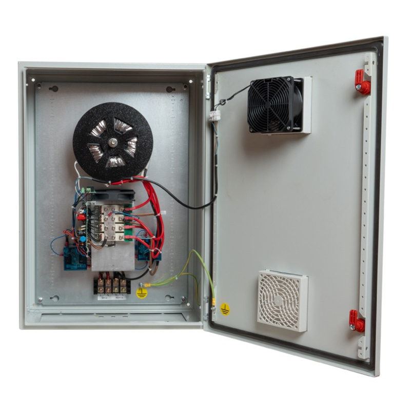 Стабилизатор сетевого напряжения уличный 10 кВА, диапазон входного напряжения 80–283 В, выходное напряжение 220 В ±7%, точность стабилизации 7%, 5 ступеней регулирования, IP54, -30°C до +45°C, для улицы и влажных помещений, 500×700×250 мм, вес 35 кг, корпус сталь