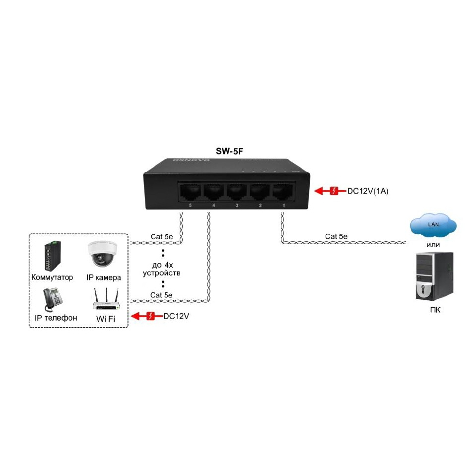 Неуправляемый коммутатор Fast Ethernet на 5 портов. Порты: 5 x FE (10/100Base-TX). Auto MDI/MDIX Встроенная грозозащита 2кВ. В комплекте БП DC12V(1A). Размеры (ШхВхГ): 100 x 23 x 65мм. Рабочая температура: 0...+40 гр. С.