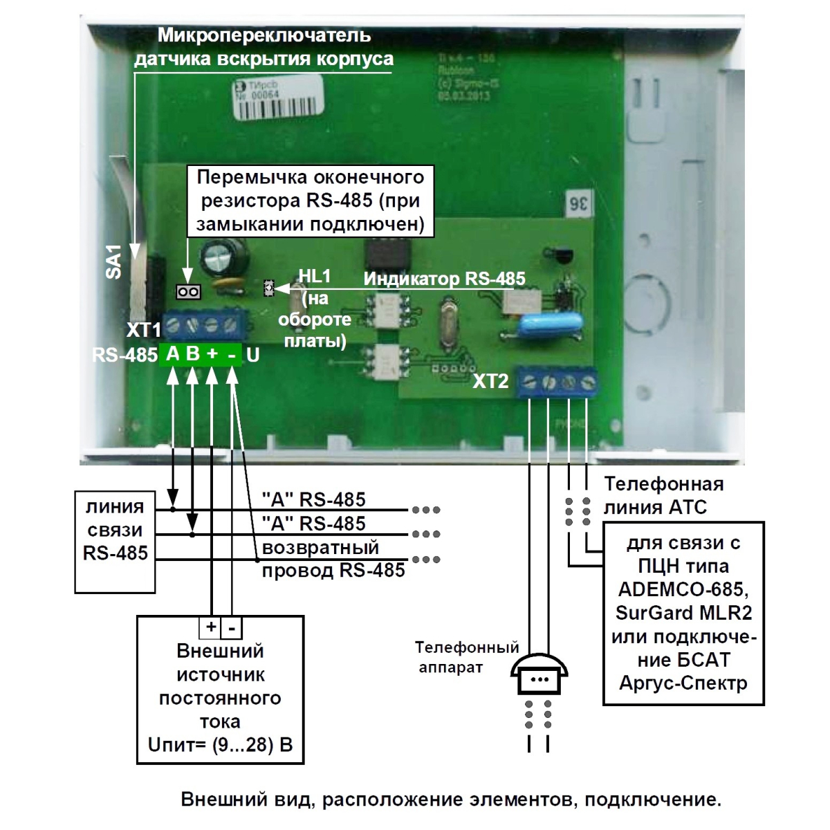 телефонный информатор, передача извещений на пульты централизованного наблюдения по телефонной линии, интерфейс RS-485, питание 9-28 В, ток потребления до 200 мА, рабочий диапазон телефонной линии 18-60 В, -10 до +55 °C, 170x112x35 мм, масса 0,3 кг