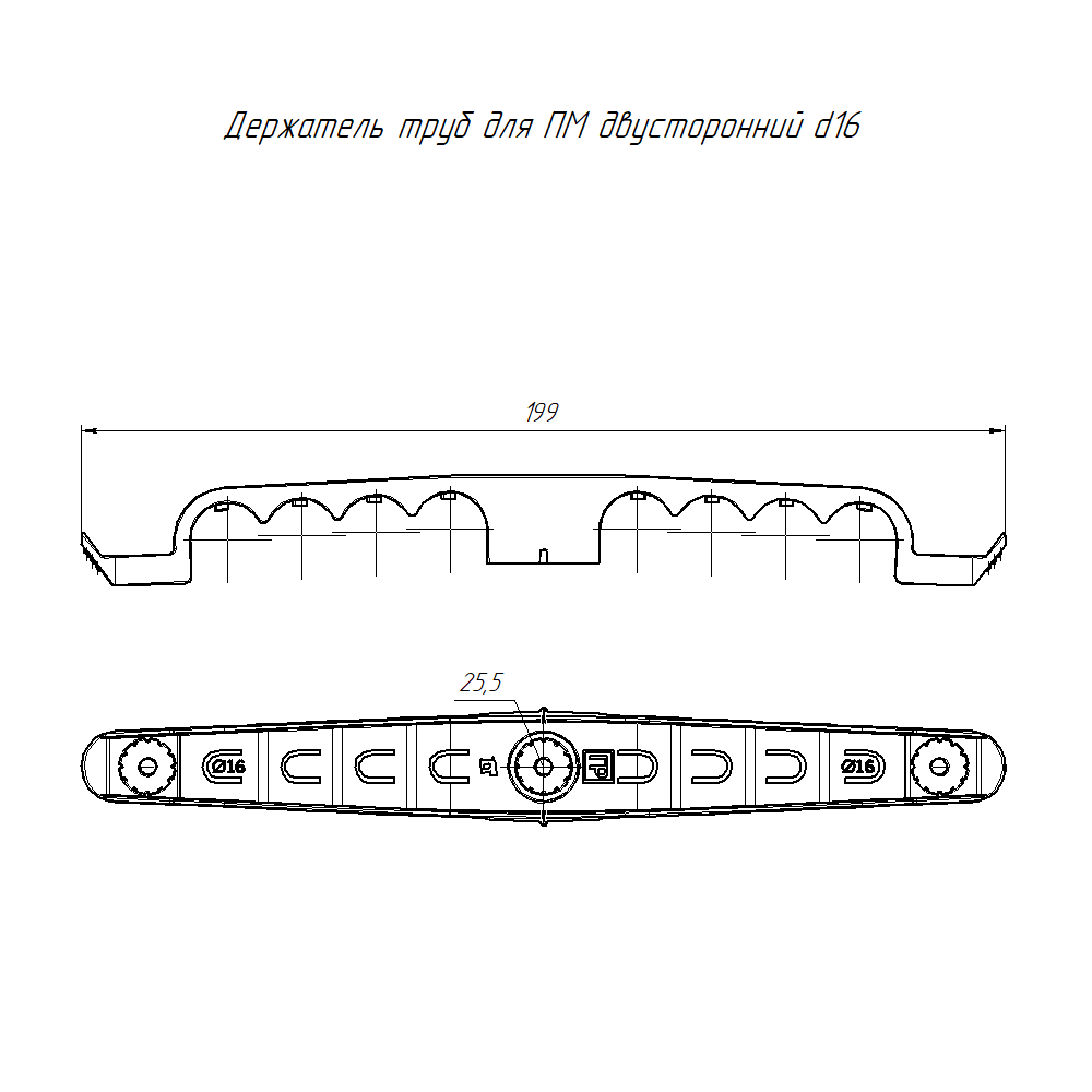 Держатель труб для прямого монтажа двусторонний на 8 мест d16 Промрукав - это специализированный крепеж, предназначенный для крепления гофрированных и гладких пластиковых труб диаметром 16 мм. Держатель труб разработан для прямого монтажа, что позволяет осуществлять крепление монтажными пистолетами по бетонным поверхностям, но возможен монтаж и классическим способом, используя дюбели и саморезы. С помощью двустороннего держателя труб можно одновременно смонтировать и закрепить до 8 труб. Данную продукцию можно использовать при прокладке линии внутри помещений или под навесом. При необходимости допускается фиксировать края держателя, в том числе монтажным пистолетом, для обеспечения максимально возможной надежности фиксации трубы.