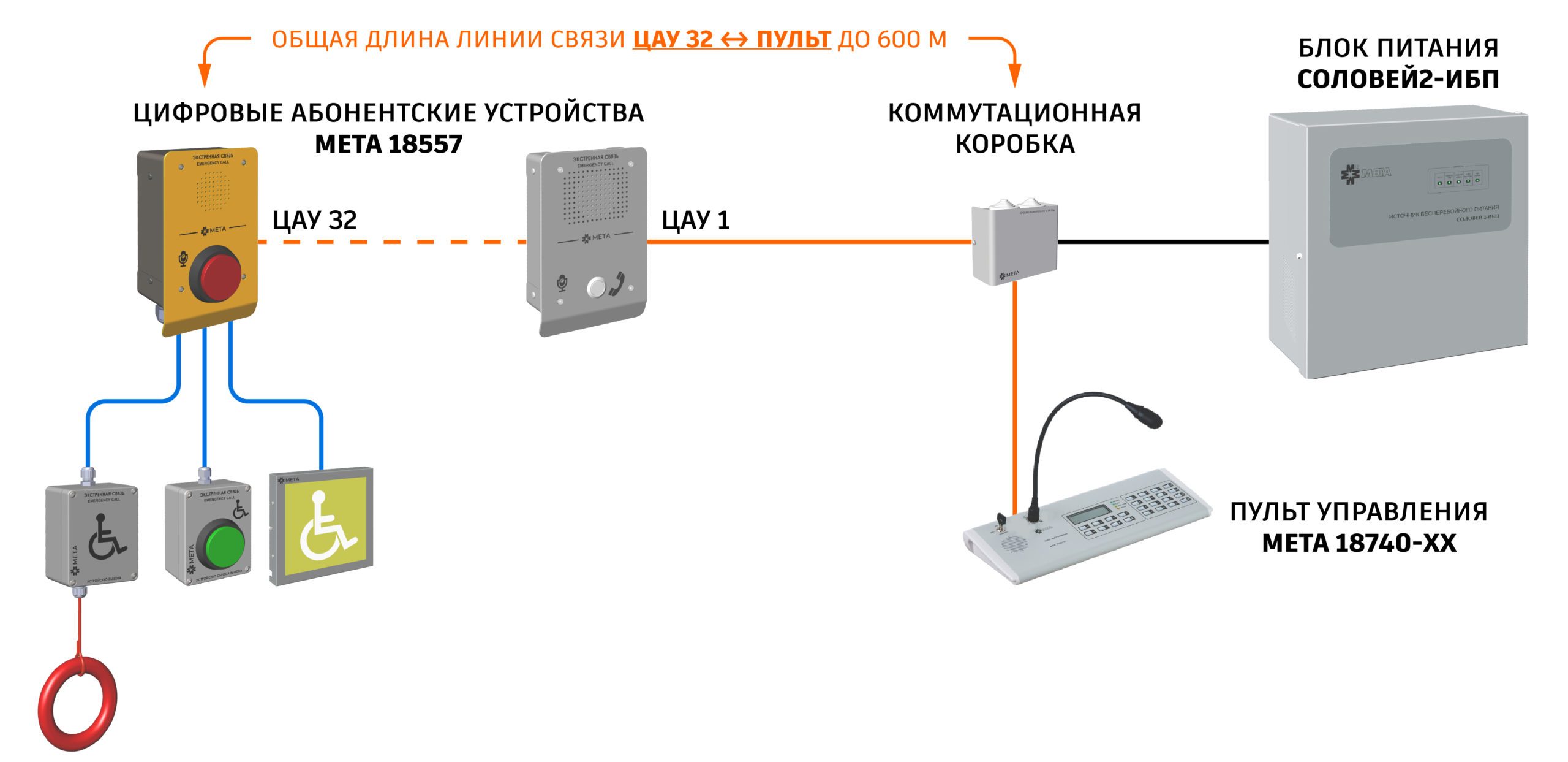 Функциональные возможности ● Полудуплексная связь ● До 2-х микрофонных пультов в системе ● Подключение до 256 независимых цифровых абонентских устройств ● Подключение до 1024 аналоговых абонентских устройств (256 независимых линий) ● Возможность подключения светозвуковых оповещателей и кнопок сброса для МГН ● Контроль целостности линий ● Индикация сигнала «НЕИСПРАВНОСТЬ» по каждой линии связи ● Контроль линий речевых и световых оповещателей на КЗ и обрыв ● Индикация сигнала «ВЫЗОВ» по каждой линии связи ● Сигнал «НЕИСПРАВНОСТЬ» во внешние цепи ● Контроль линий от ППК на КЗ и обрыв ● Сигнал «НЕИСП РАВНОСТЬ» во внешние цепи ● Сигнал «ЗАПУСК СИСТЕМЫ» во внешние цепи ● Гибкая настройка с ПК Состав системы: Пульт микрофонный МЕТА 18740 Блок связи МЕТА 17560 Блок усиления МЕТА 17661 Источник бесперебойного питания Соловей2‑ИБП Абонентское устройство МЕТА 18555 Абонентское устройство МЕТА 18556 исп. У Абонентское устройство МЕТА 18556 исп. Н Абонентское устройство МЕТА 18556 исп. В Абонентское устройство МЕТА 18557 исп. В Абонентское устройство МЕТА 18557 исп. В1 Абонентское устройство МЕТА 18557 исп. Н Абонентское устройство МЕТА 18557 исп. У Абонентское устройство МЕТА 18557 исп. МГН Устройство сброса МЕТА 7520 Устройство вызова МЕТА 7521 Звуковое и визуальное аварийное сигнальное устройство МЕТА 7523Технические характеристики: