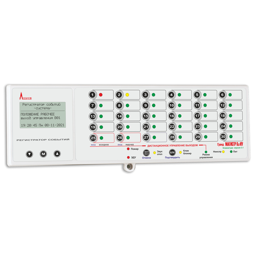 Блок клавиатуры для контроля и управления состоянием клапанов дымоудаления или огнезадерживающих клапанов и других исполнительных устройств, подключенных к выходам управления блоков ключей Гранд МАГИСТР БК-1 или Гранд МАГИСТР БК-2; до 30 контролируемых выходов управления; RS-485;U-пит.12 В, I-потр.40 мА; IP50, t-раб.+5...+55°С, 295х95х32 мм