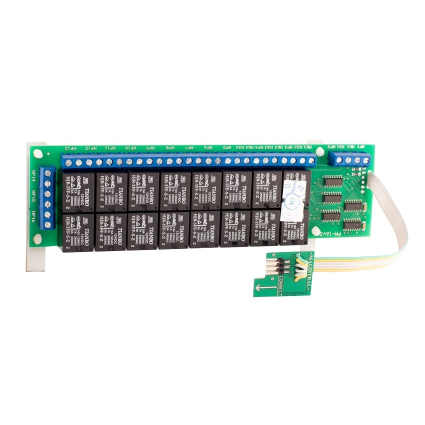 Релейный модуль на 16 мощных управляющих реле (250В, 7А) для установки в Прибор охранно-пожарный модульного типа "Гранд Магистр-8-30"; каждое реле может быть запрограммировано на сработку от любого количества ШС одного типа: охранного по схеме "И" или пожарного по схеме "ИЛИ". Логика работы реле соответствует логике работы реле ПЦН соответствующего ШС.