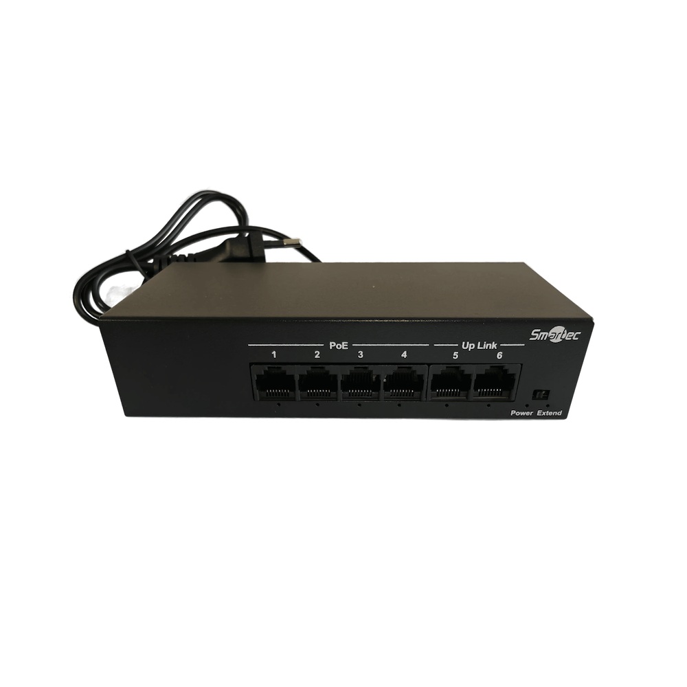 Неадминистрируемый коммутатор, 4 RJ-45 POE портов (10/100 Мбит/с), 2 RJ-45 Uplink порта (10/100 Мбит/с), бюджет на порт до 30 Вт, общий бюджет до 50Вт.