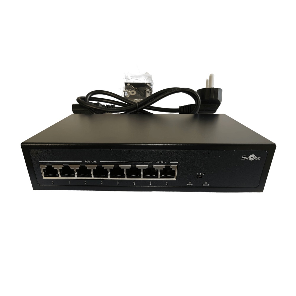 Неадминистрируемый коммутатор, 6 RJ-45 POE портов (10/100 Мбит/с), 2 RJ-45 Uplink порта (10/100 Мбит/с), бюджет на порт до 30 Вт, общий бюджет до 75Вт.