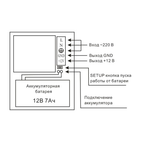 - Световая индикация: состояние линии 220 В, состояние линии 12 В, состояние аккумуляторной батареи