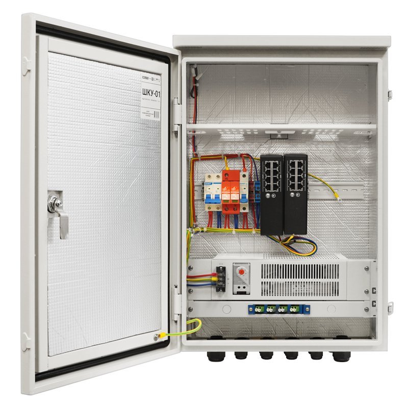 Шкаф предназначен для установки телекоммуникационного и прочего электротехнического оборудования с целью защиты установленного внутрь оборудования от воздействия окружающей среды и несанкционированного доступа. Шкаф оснащён системой поддержания микроклимата с помощью встроенных элементов: обогревателя, вентилятора и термостата с возможностью установки температуры включения обогрева. Так же, состав шкафа, входит дополнительный вентилятор малой мощности, уставленный в верхней части корпуса, для улучшения рециркуляции воздуха и снижения риска возникновения конденсата. Вентилятор подключен через отдельный автоматический выключатель.