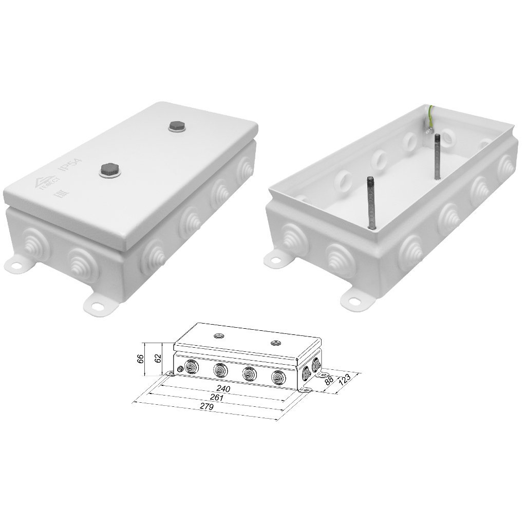 Коробка монтажная огнестойкая, 12 вводов под кабель D 4...17 мм, IP55, t-раб.-40…+80°C, габ.размеры 123х240х62 мм, оцинкованная сталь с полимерной окраской