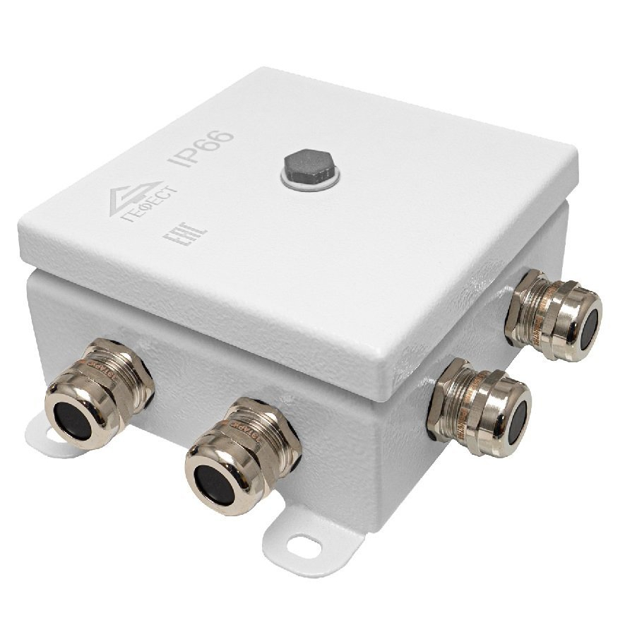 Коробка монтажная, 8 вводов из никелированной латуни под кабель 4…18 мм, DIN-рейка, IP66, t-раб.-40…+100°С, 123х123х62 мм. Цвет белый. Корпус из листовой конструкционной стали Ст3 толщиной 1.2 мм.
