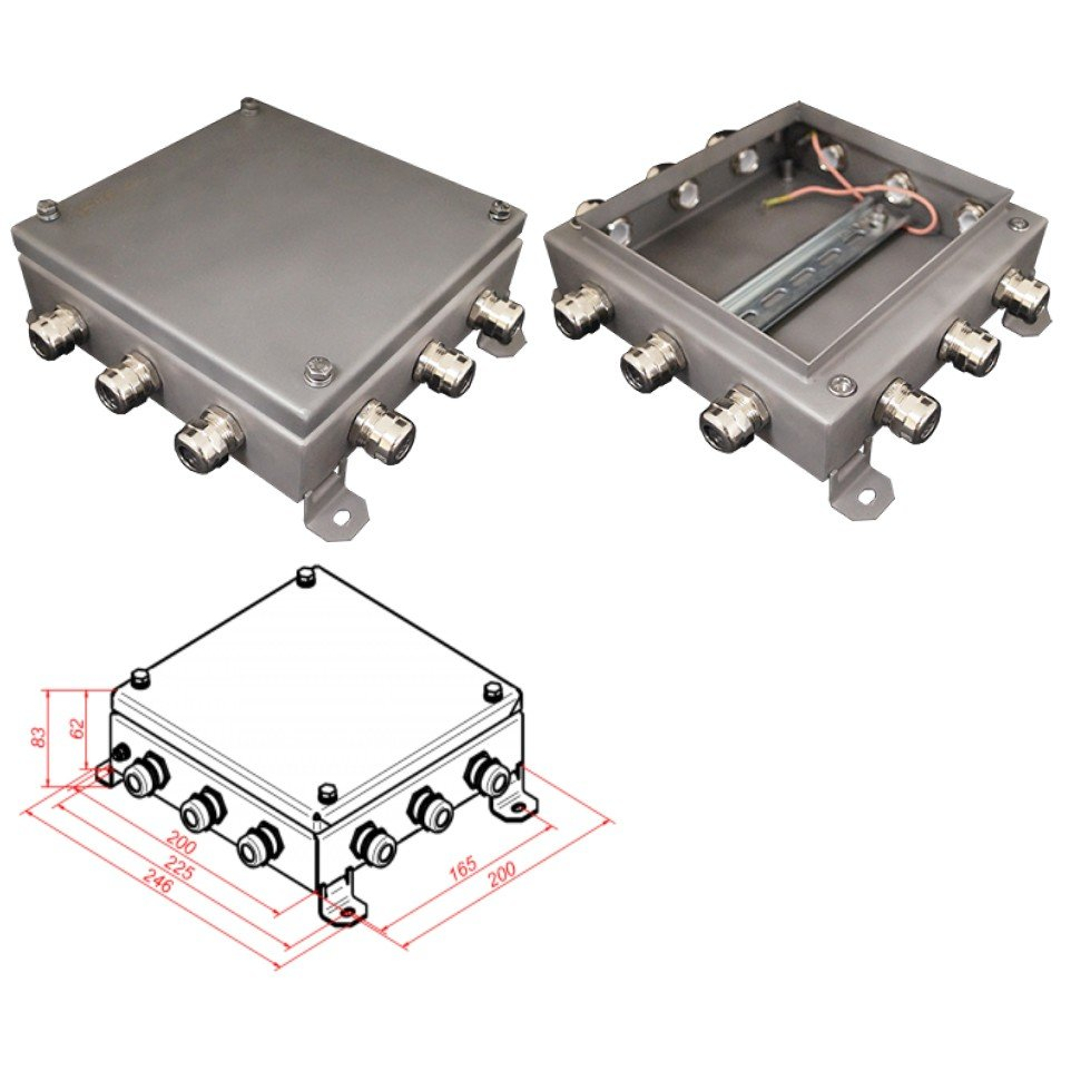 Коробка монтажная с DIN-рейкой -типа шириной 35 мм и высотой 7.5 мм, 12 вводов, IP66, tраб.-40…+60°С, габ.размеры 200х200х60 мм, вес 2.09кг, нержавеющая сталь