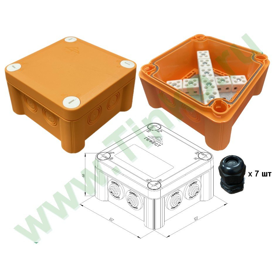 Коробка монтажная огнестойкая, пластиковая, стойкая к УФ, 7 пластиковых каб.вводов под кабель 6…12 мм (устанавливаются самостоятельно в удаляемые профили), керамический клеммник на 18 полюсов, сечение подключаемых проводов 3 мм , У1, IP66, t-раб. -40…+80°С, габ.размеры 122х122х66 мм , цвет оранжевый.