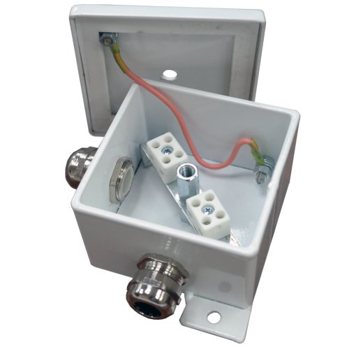Корпус коробки целиком изготовлен из стали 2,5-3 мм. Имеет двойную защиту от коррозии (гальваническое покрытие и покраска). Крышка прижимается к корпусу через силиконовую прокладку. Винт крепления крышки снабжен уплотняющей тарельчатой шайбой с фторопластовым покрытием. Внутри корпуса коробки установлены керамические клеммные колодки, обеспечивающие соединение "под винт", и клемма заземления. В боковых стенках устанавливаются металлические кабельные вводы. Крепление коробки к элементам конструкций рекомендуется осуществлять на приварные пластины с применением гаек и винтов или с помощью саморезов и металлических дюбелей. Используются на улице и внутри помещения (IP66), обеспечивают высокий уровень механической защиты и защиту от грызунов. Легко выдерживают падение гири 2 кг с высоты 1 метр. Гермоввод под кабель 6 - 12 мм (по требованию заказчика могут устанавливаться кабельные вводы иного диаметра при наличии технологических возможностей изготовления). Обеспечивают огнестойкое соединение кабелей с пределом FR 120 минут и более при температурном воздействии 750...800°СТехнические характеристики: