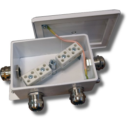Корпус коробки целиком изготовлен из стали 2,5-3 мм. Имеет двойную защиту от коррозии ( гальваническое покрытие и покраска). Крышка прижимается к корпусу через силиконовую прокладку. Винт крепления крышки снабжен уплотняющей тарельчатой шайбой с фторопластовым покрытием. Внутри корпуса коробки установлены керамические клеммные колодки, обеспечивающие соединение "под винт", и клемма заземления. В боковых стенках устанавливаются металлические кабельные вводы. Крепление коробки к элементам конструкций рекомендуется осуществлять на приварные пластины с применением гаек и винтов или с помощью саморезов и металлических дюбелей. Коробки предназначены для монтажа кабельных линий с огнестойким кабелем, но могут применяться с любыми другими кабелями в целях улучшения пожаробезопасности электропроводок. Гермоввод под кабель 6 - 12 мм2 (по требованию заказчика могут устанавливаться кабельные вводы иного диаметра при наличии технологических возможностей изготовления) Обеспечивают огнестойкое соединение кабелей с пределом FR 120 минут и более при температурном воздействии 750 – 800° С Сертификационными испытаниями подтверждено сохранение работоспособности до температуры 1020° С при напряжении 300 В (с учетом требований п.4.15 СП5 испытания проводились по ГОСТ Р 53316).Технические характеристики: