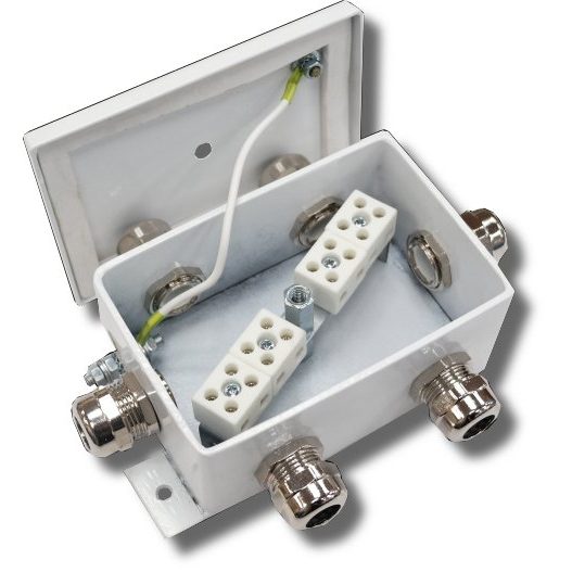 Корпус коробки целиком изготовлен из стали 2,5-3 мм. Имеет двойную защиту от коррозии ( гальваническое покрытие и покраска). Крышка прижимается к корпусу через силиконовую прокладку. Винт крепления крышки снабжен уплотняющей тарельчатой шайбой с фторопластовым покрытием. Внутри корпуса коробки установлены керамические клеммные колодки, обеспечивающие соединение "под винт", и клемма заземления. В боковых стенках устанавливаются металлические кабельные вводы. Крепление коробки к элементам конструкций рекомендуется осуществлять на приварные пластины с применением гаек и винтов или с помощью саморезов и металлических дюбелей. Коробки предназначены для монтажа кабельных линий с огнестойким кабелем, но могут применяться с любыми другими кабелями в целях улучшения пожаробезопасности электропроводок. Гермоввод под кабель 6 - 12 мм2 (по требованию заказчика могут устанавливаться кабельные вводы иного диаметра при наличии технологических возможностей изготовления) Обеспечивают огнестойкое соединение кабелей с пределом FR 120 минут и более при температурном воздействии 750 – 800° С Сертификационными испытаниями подтверждено сохранение работоспособности до температуры 1020° С при напряжении 300 В (с учетом требований п.4.15 СП5 испытания проводились по ГОСТ Р 53316).Технические характеристики: