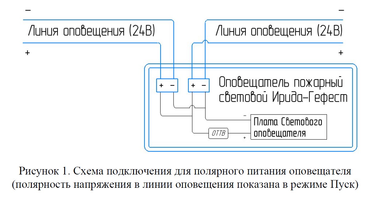 • трафаретный способ формирования изображения (под защитным стеклом) с торцевой подсветкой при активации (включении): - возможность размещение любых пиктограмм, знаков безопасности или текста на любом языке; - информация воспринимаема во включенном и выключенном состоянии; - контрастное восприятие информации в условиях прямой засветки до 500 лк. • возможность работы в режиме постоянного включения (например, «ВЫХОД», «НАСОСНАЯ СТАНЦИЯ» и др.); • активация оповещения (включение) путем подачи напряжения питания определенной полярности; • возможно мигающее исполнение с частотой мигания от 0,5 до 2 Гц (например, обратная полярность – непрерывное свечение, прямая полярность – мигание); • диапазон рабочих температур от минус 40°С (исполнение "Север" – от минус 60°С); • подключение оповещателей обеспечивает разрыв контролируемой линии оповещения (формирование сигнала «Неисправность» на ППУ) при изъятии оповещателя; • применение ограничителя тока с тепловым взводом и керамических клемм. Возникновение неисправности в оповещателе (в результате теплового воздействия при пожаре) не оказывает влияние на работоспособность других оповещателей, подключенных к данным проводным линиям (требования п. 6.2.1.17 ГОСТ Р 53325-2012 и п. 5.1.24 ГОСТ 34699-2020); • корпус из оцинкованной стали, окрашенной в белый цвет (по желанию заказчика, может быть окрашена в любой цвет из палитры RAL) или из нержавеющей стали (в том числе для исполнения "Север"); • при установке на улице необходимо использовать козырек.Технические характеристики: