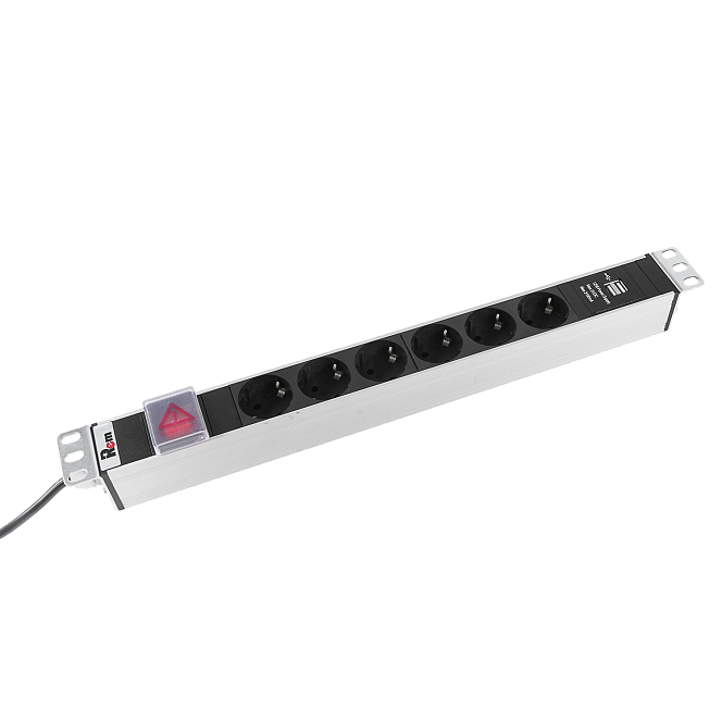 Блок розеток Rem-16 с выкл и USB-портом, 6 Schuko, 16A, алюм., 19, шнур 1,8 м.