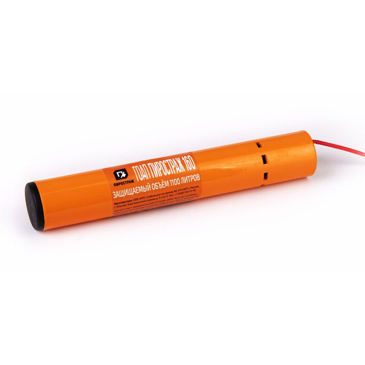Генератор огнетушащего аэрозоля с термошнуром, для тушения пожаров класса А2, В, С и Е, температура срабатывания 170°C, защищаемый объем 1100 л, инерционность срабатывания 1 сек, время подачи огнетушащего аэрозоля 5 сек, t-раб. -60...+95°C.