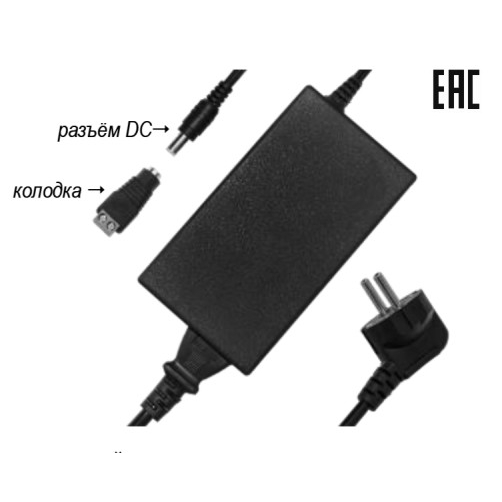 Подключение нагрузки осуществляется через DC-разъём или соответствующим кабелем через штатную двухконтактную клеммную колодку с соблюдением полярности, которая указана на клеммной колодке