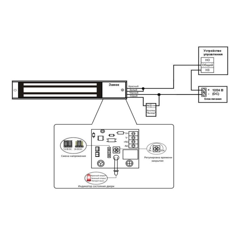 Замок электромагнитный. Сила удержания 350кг, встроенный блок управления от кнопки выход с индикацией состояния замка (красный-включён, зелёный-отключён), регулировка времени отключения 0...10сек. Питание: DC 12/24B, 0,45/0,24А. -40...+50°С. Габаритные размеры замка: 250x56x32мм.