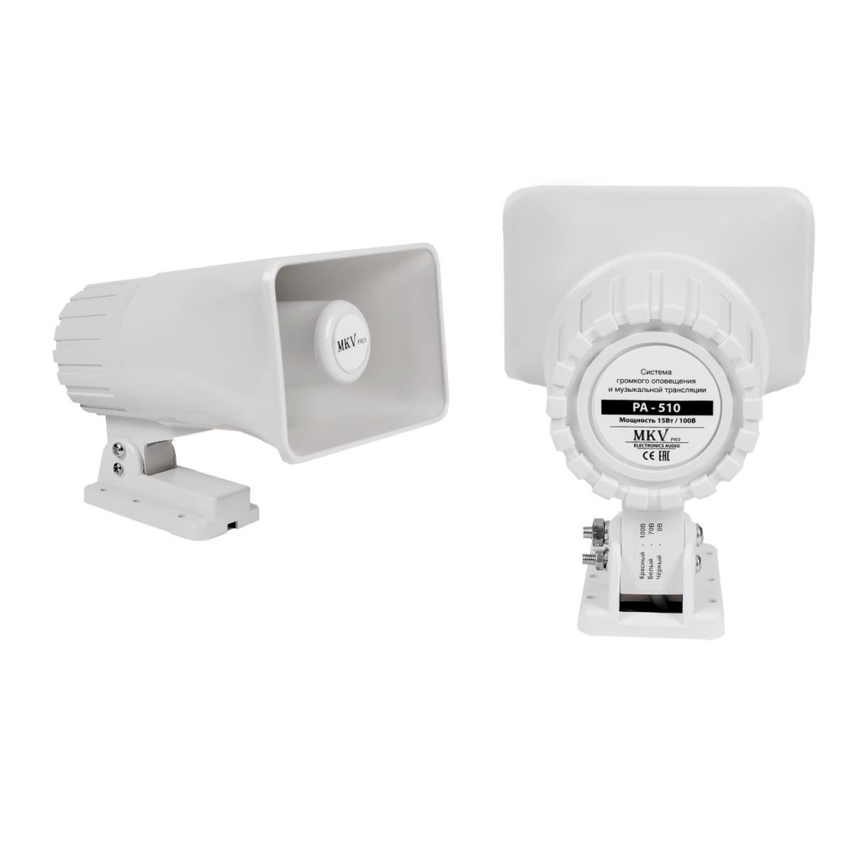 Всепогодный настенный рупорный громкоговоритель 15 Вт/100 В, 100 ±3 дБ, 500-5000 Гц Материал: АБС пластик. Габариты: 150х100х203 мм