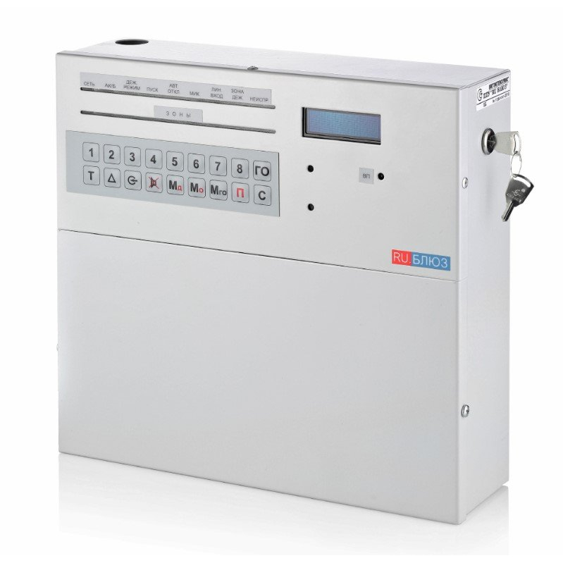 Блок базовый ППУ Блюз RU, 8 зон, 2 служеб.зоны, до 8 БЛ в зоне, 2 х RS485, 2 х ЛЗ (30В), вх.ручного запуска, Uпит.220В, под АКБ 12В/7Ач, IP41, 230х220х75мм.