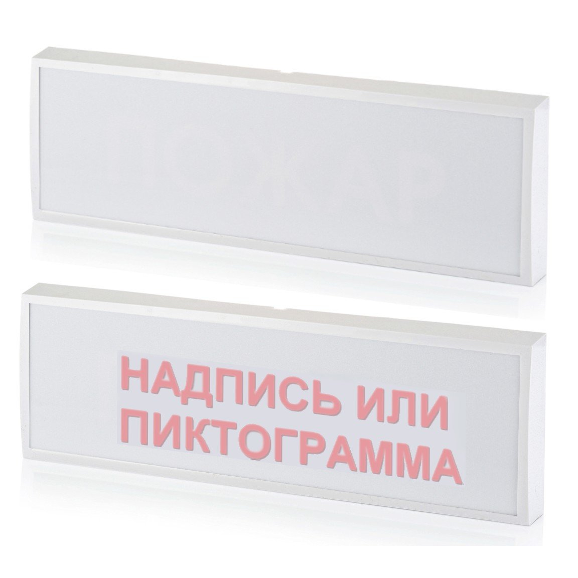 Оповещатель пожарный световой, светодиодный, пласт.рамка, скрытая надпись, U-пит. номин. 12...36 В, I-потр. 20мА, IP54, t-раб.-50...+55°С, габ. размеры 300х100х25 мм.