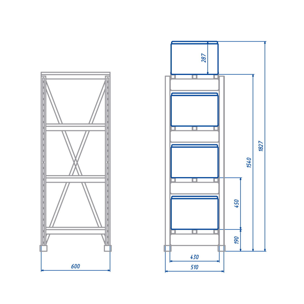 Стеллаж аккумуляторный 600х510х1575, 20 АКБ 100FT (4 яруса 5х1)