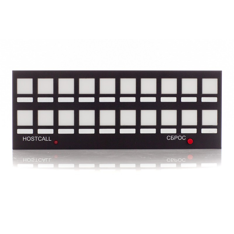 Табло отображения для системы вызова посетителей в кабинет HostCall-CV обеспечивает дублирование состояния занятости по командам от табло MP-730W1, световую и акустическую индикацию. На передней панели находятся 20 сегментов с 2-х цветным светодиодным индикатором вызова и полем белого цвета для номера кабинета. В нижней правой части табло отображения MP-730W2 расположена кнопка СБРОС, для временного отключения звука, в левой – индикатор включения питания. Накладное крепление. 12 В, 0,24 А, 57 Дб, +5...+45 °С, 265х100х30 мм