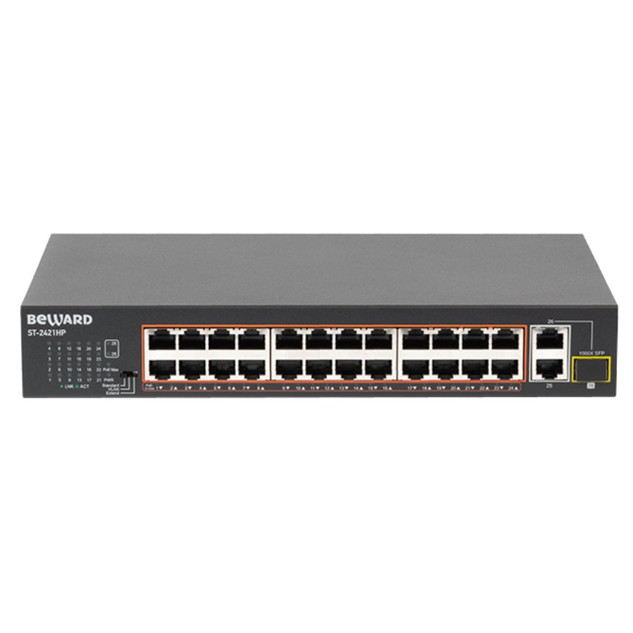 Коммутатор ST-2421HP имеет 2 независимых uplink порта, один из которых - RJ-45, а второй – комбинированный, то есть на выбор можно задействовать RJ-45 или SFP порт для подключения оптоволокна. Благодаря наличию двух Uplink портов, работающих на скорости 1000 Мбит/с, коммутатор можно использовать при построении сети по топологии шина для больших систем видеонаблюдения, задействовав оба порта одновременно. Так же, два Uplink порта позволяют не использовать дополнительные коммутаторы при использовании PoE коммутатора ST-2421HP в качестве центрального: при подключении к нему устройства записи остаётся свободный порт для выхода во внешнюю сеть.