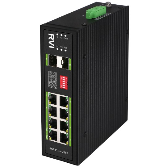 Коммутатор сетевой промышленный, неуправляемый 10 портовый гигабитный, 8xRJ45 РоЕ 10/100/1000 Мбит/с, IEEE 802.3at/af/bt, 1 порт до 90 Вт, 2-8 порт 30 Вт, 2xSFP Uplink 1000 Мбит/с, PoE бюджет до 300 Вт, Watchdog, Vlan, дальность передачи до 250 метров, монтаж на DIN-рейку, DC 37…57В, 6.3 А, 305Вт (БП в комплект не входит), грозозащита 6кВ, -40°C…+80°C, 160х130х50 мм.