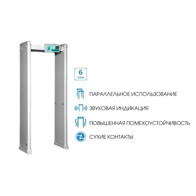 6-ти зонный металлодетектор, 200 уровней чувствительности, селективность магнитные и немагнитные металлы, счетчик проходов, выход сухой контакт, три способа подключения к сети (справа, слева, сверху), экраны детектирования с обеих сторон металлодетектора, 85 -264 В, 12 Вт, -20...+85 °С, внешние габариты 2200х810х580 мм, габариты прохода 2000х700х500 мм