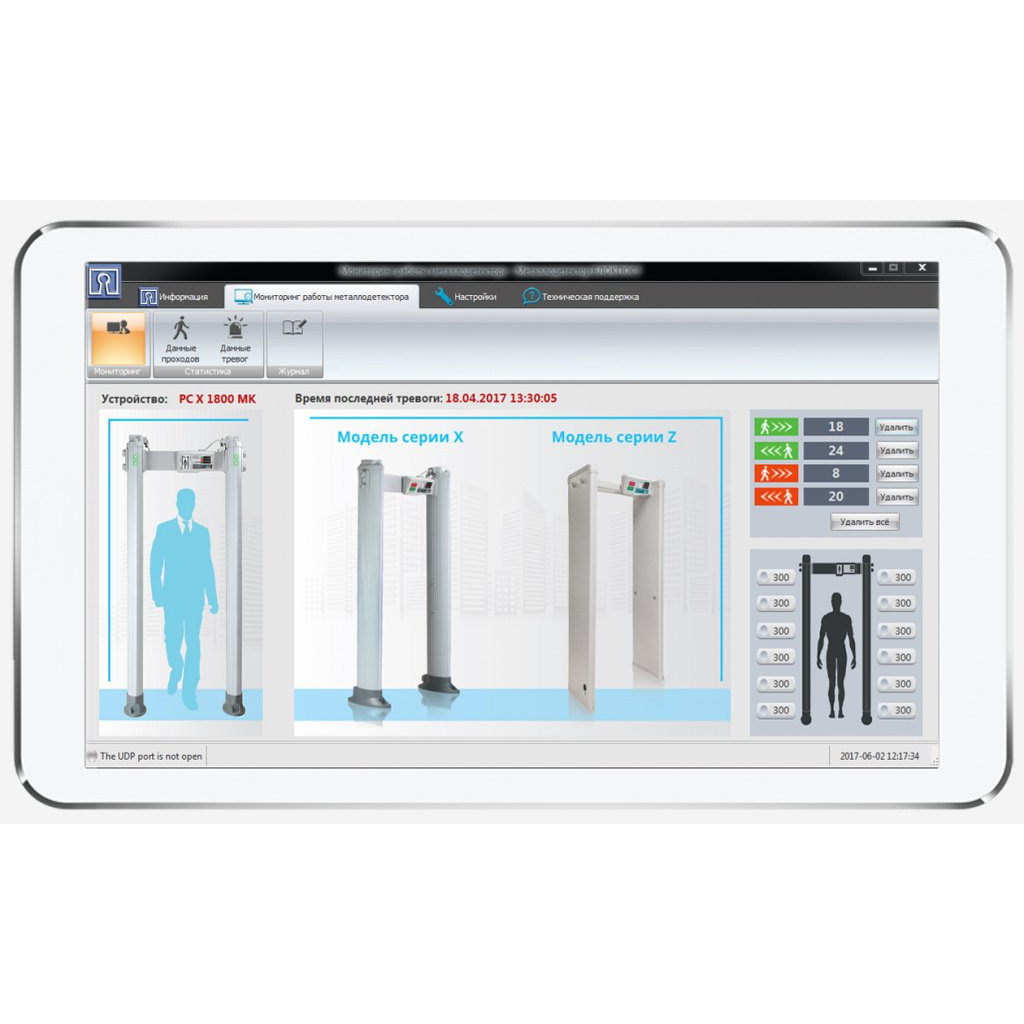 ПО для металлодетекторов БЛОКПОСТ с функциями: настройки, контроля состояния работы, учёта количества проходов/тревог, регистрации событий в реальном времени.