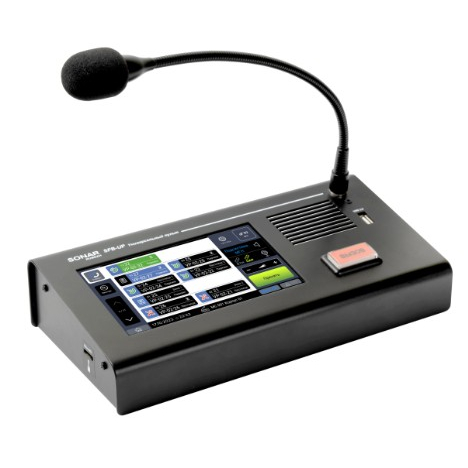 Пульт микрофонный SFB-UP: сенсорный экран, встроенный микрофон, подключение к моноблокам SPM v2.0, системе обратной связи по интерфейсу DAP/ETH, доп. вход питания 24 В