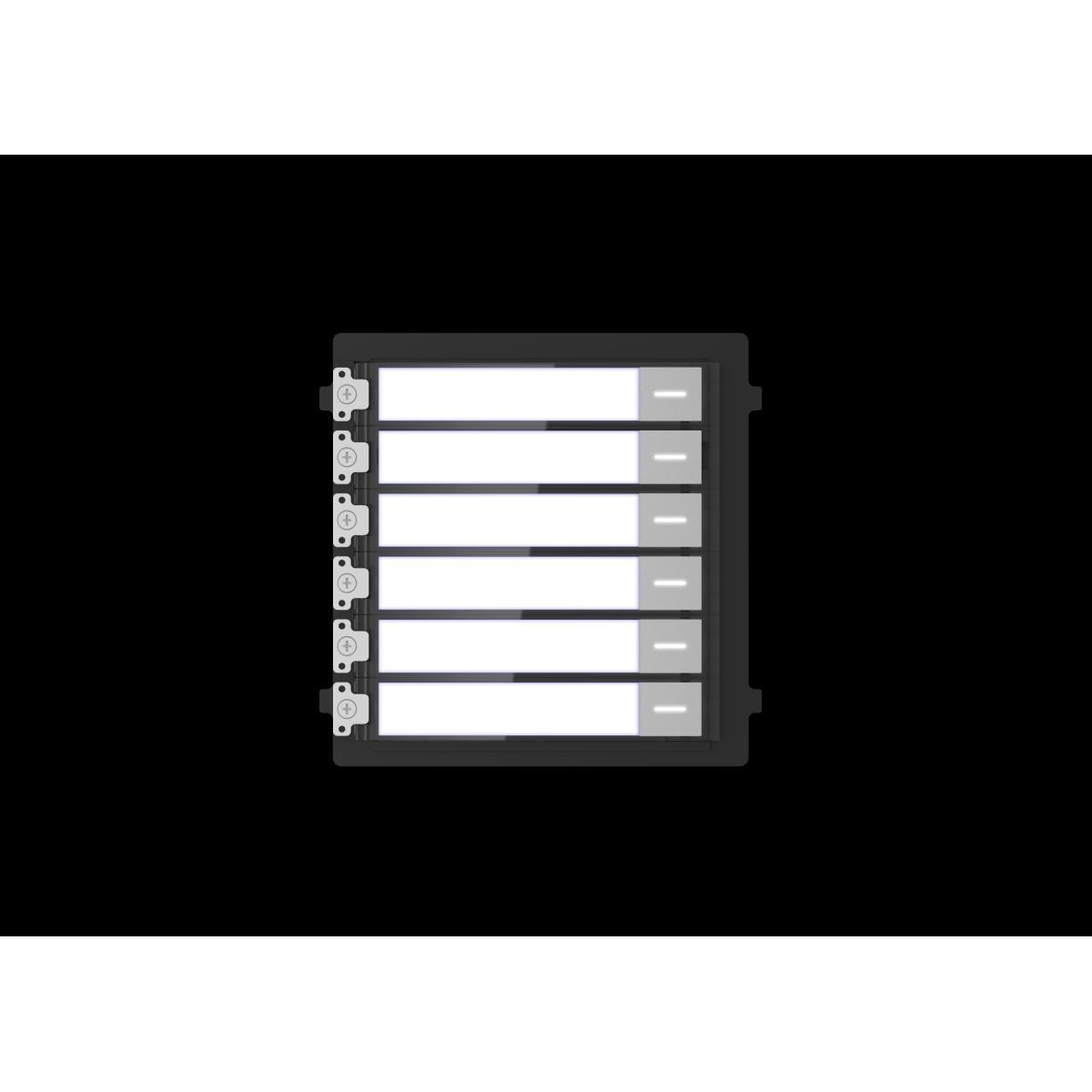 Модуль на 6 абонентов c подсветкой 6 механических кнопок, сменные подписи, модульный разъем 1+1, DC 12В, питание от основного модуля 10Вт, -40 °C до +70°C, IP65, размер 98 100 34мм, пластик.