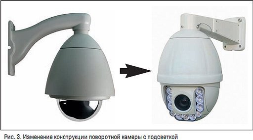 Еще более серьезная проблема прямой засветки от встроенного осветителя имеется в купольных поворотных камерах, где даже бленды практически не применимы. По необходимости такие камеры постепенно возвращаются к уже "забытым" поворотным системам с обилием скользящих сочленений, подверженных проникновению влаги и размораживанию по сравнению с классическими купольными поворотными камерами. Эта эволюция представлена на рис. 3.