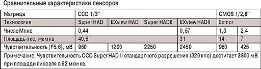 Несмотря на огромные успехи в совершенствовании технологии CMOS, CCD все еще более чем в 2,5 раза превосходят по чувствительности даже лучшие образцы CMOS-матриц Exmor. К сожалению, новейшая технология Exmor R с обратной засветкой и характеристиками, уже совсем близкими CCD, в основном используется в мобильных устройствах. Сравнительные характеристики сенсоров приведены в таблице.